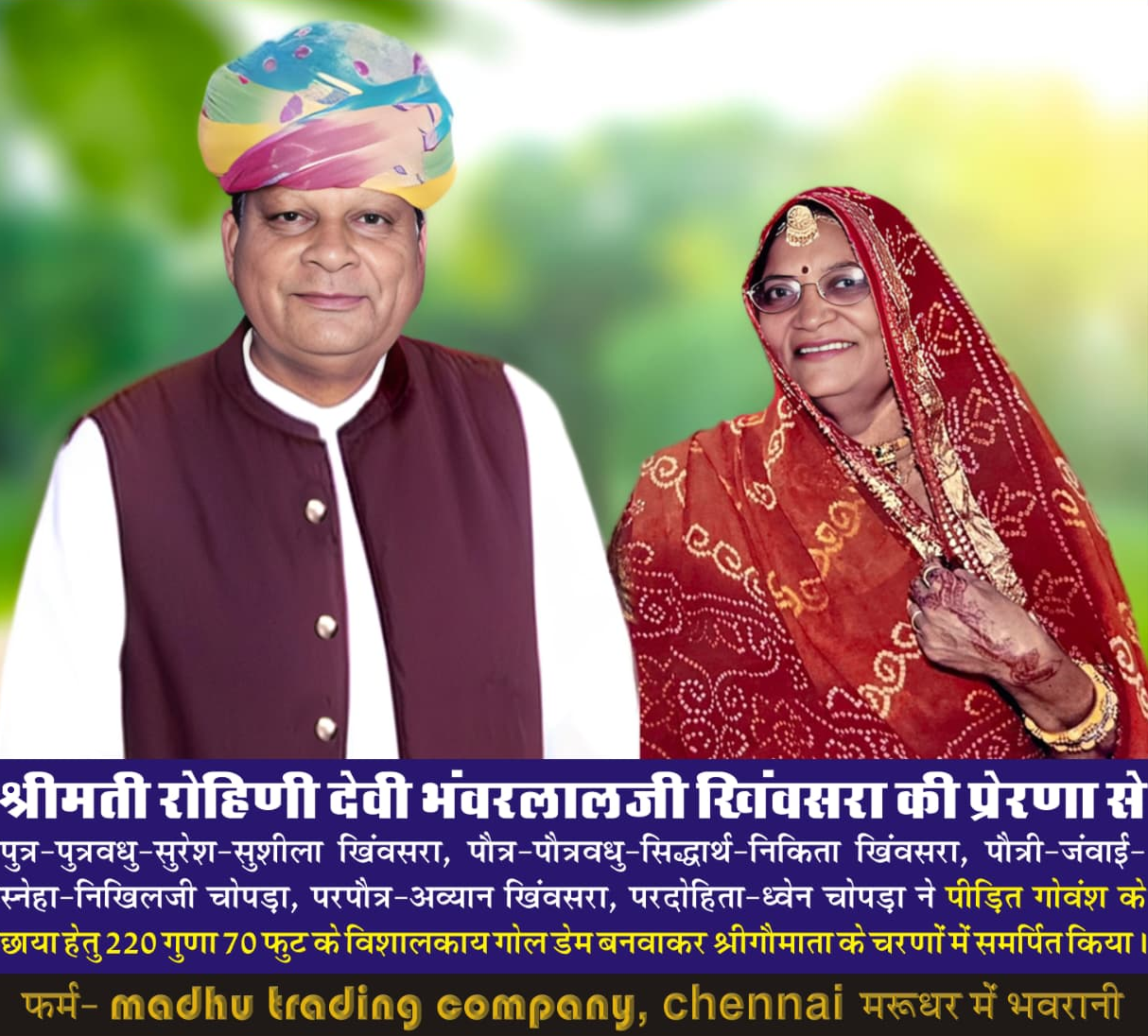 Inspired by the noble spirit of Shrimati Rohini Devi Bhanwarlalji Khinvesra ๐ธ, Her devoted family along with Suresh & Sushila Khinvesra ๐, Siddharth & Nikita Khinvesra ๐, Sneha & Nikhil Chopra ๐, Avyaan Khinvesra ๐ถ, and Dhven Chopra ๐ถ – have lovingly dedicated a massive dome structure ๐๏ธ measuring 220 x 70 feet ๐ for the shelter and protection of afflicted cows ๐, offered humbly at the feet of Shri Gau Mata ๐๏ธ.